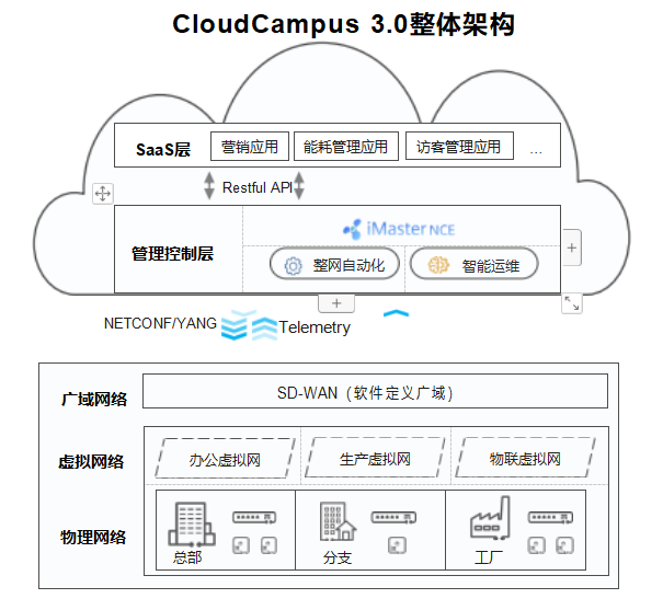 華為云園區(qū)網(wǎng)絡(luò)解決方案3.0 (CloudCampus 3.0) , 應用IoT、Wi-Fi 6、 SDN、 SD-WAN、云管理和AI等 技術(shù),幫助企業(yè)構(gòu)建一張全無線接入,全球一張網(wǎng),全云化管理和全智能運維的園區(qū)網(wǎng)絡(luò)。從而,企業(yè)將受益于 極速的無線業(yè)務體驗,隨時隨地的自由協(xié)作和溝通,敏捷的云應用上線,以及可靠的應用體驗保障,讓大企業(yè)、政府、高校、普教、 醫(yī)療、零售、交通等各行業(yè), 在云時代抓住數(shù)字化轉(zhuǎn)型新機會。